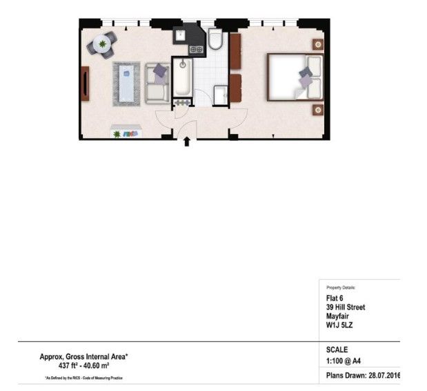 This 434 sq ft one-bedroom apartment features a generously sized double bedroom, a modern bathroom, and a spacious reception room offering charming rear-facing views over Hay's Mews. The property also boasts a unique kitchenette and provides access to an exclusive private gated communal garden, perfect for relaxation and privacy.
